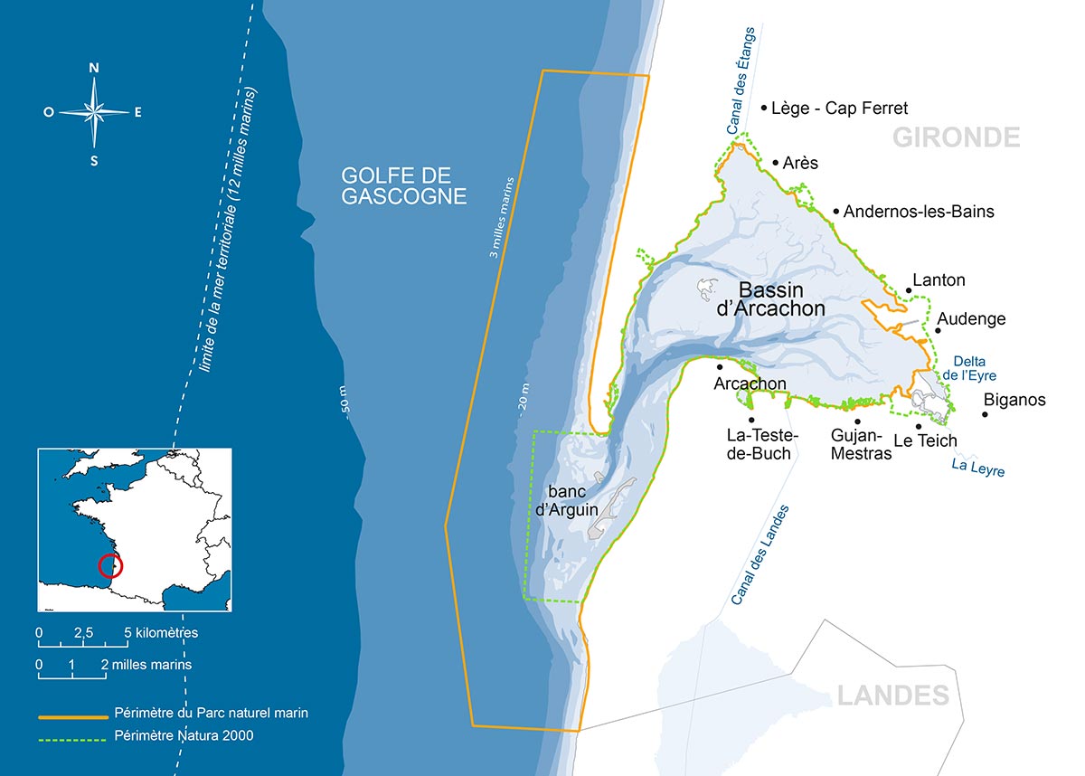 Created on June 5, 2014, the Arcachon Bay Marine Nature Park covers an area of 435 km² of marine space, between a semi-enclosed lagoon and the ocean coast. It includes the inner-basin area and the Atlantic waters up to 3 nautical miles offshore (approximately 5.5 km).